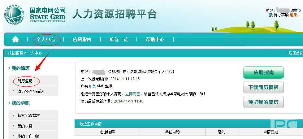 三、注冊后,需在“個人中心”中填寫簡歷,填寫的內(nèi)容比較多,防止時間過長提交過程需重新登陸,建議先“下載簡歷模板”,本地填好信息后再到系統(tǒng)中。