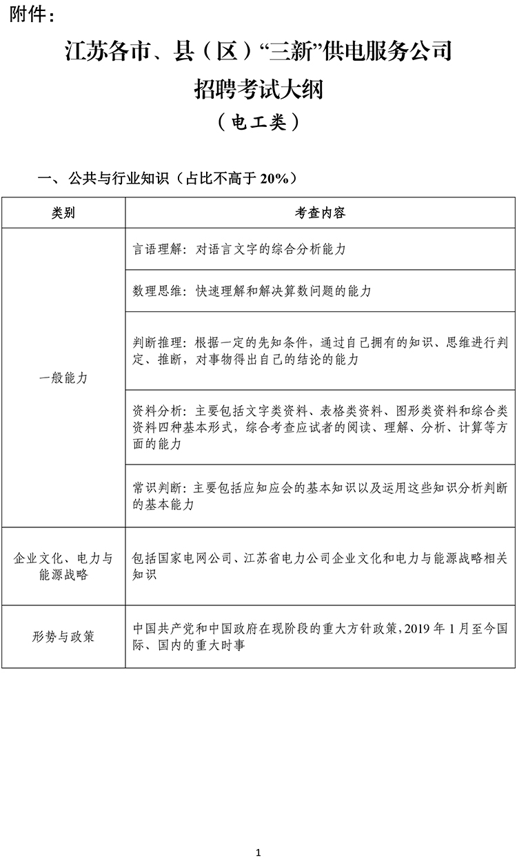 2020江蘇各市、縣(區(qū))“三新”供電服務公司招聘考試大綱(電工類)