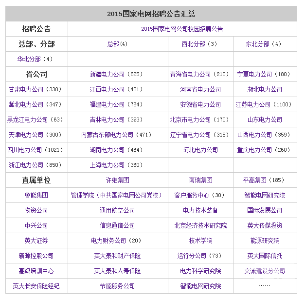 2015國家電網(wǎng)各公司校園招聘公告已經(jīng)發(fā)布,此次招聘采取網(wǎng)上報名的方式,目前大部分公司正處于報名階段,各省公司和直屬單位招聘的批次和報名的截止時間各不相同。