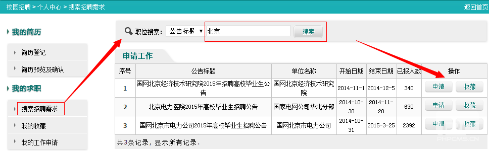 五、申請工作在“我的求職”中搜索招聘需求,可以輸入關(guān)鍵詞進行搜索,找到要申請的公司后點擊后面的申請工作后選擇職位即可。如果未定申請公司可先把心儀的進行收藏,之后再“我的收藏”里查看公告詳情,考慮之后再申請。