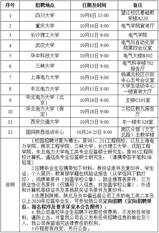 根據(jù)國網(wǎng)陜西省電力公司2020年高校畢業(yè)生招聘工作安排,現(xiàn)將校園招聘行程安排公告如下: