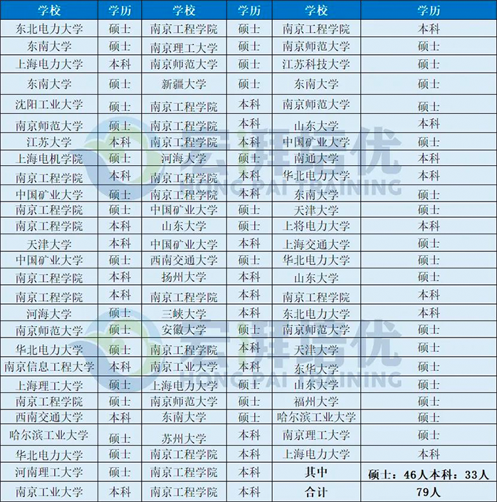 2023連云港供電公司共錄取79名新員工,其中本科生33人,碩士46人。